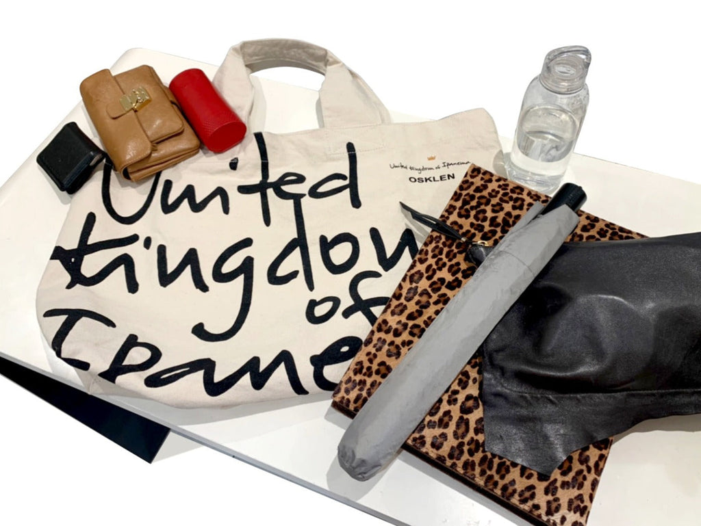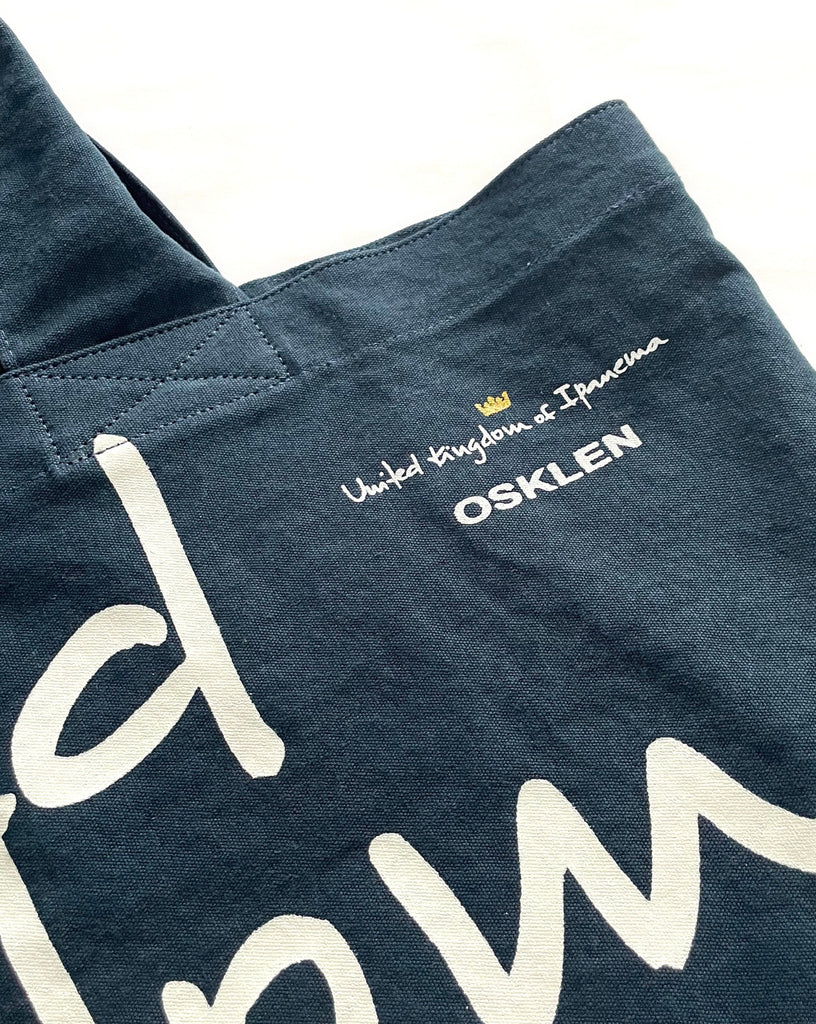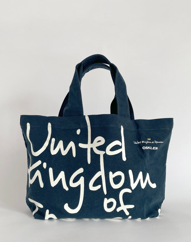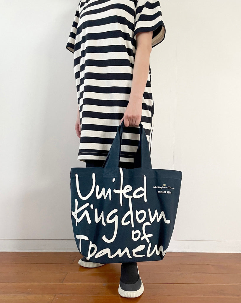 United Kingdom of Ipanema(イパネマ王国)のプリントを施したOSKLENの代表的な内ポケット付きのトートバッグです。コットン素材はe-fabricのリサイクルコットンを使用しています。ユニセックスとしてご使用いただけるデザインになっています。